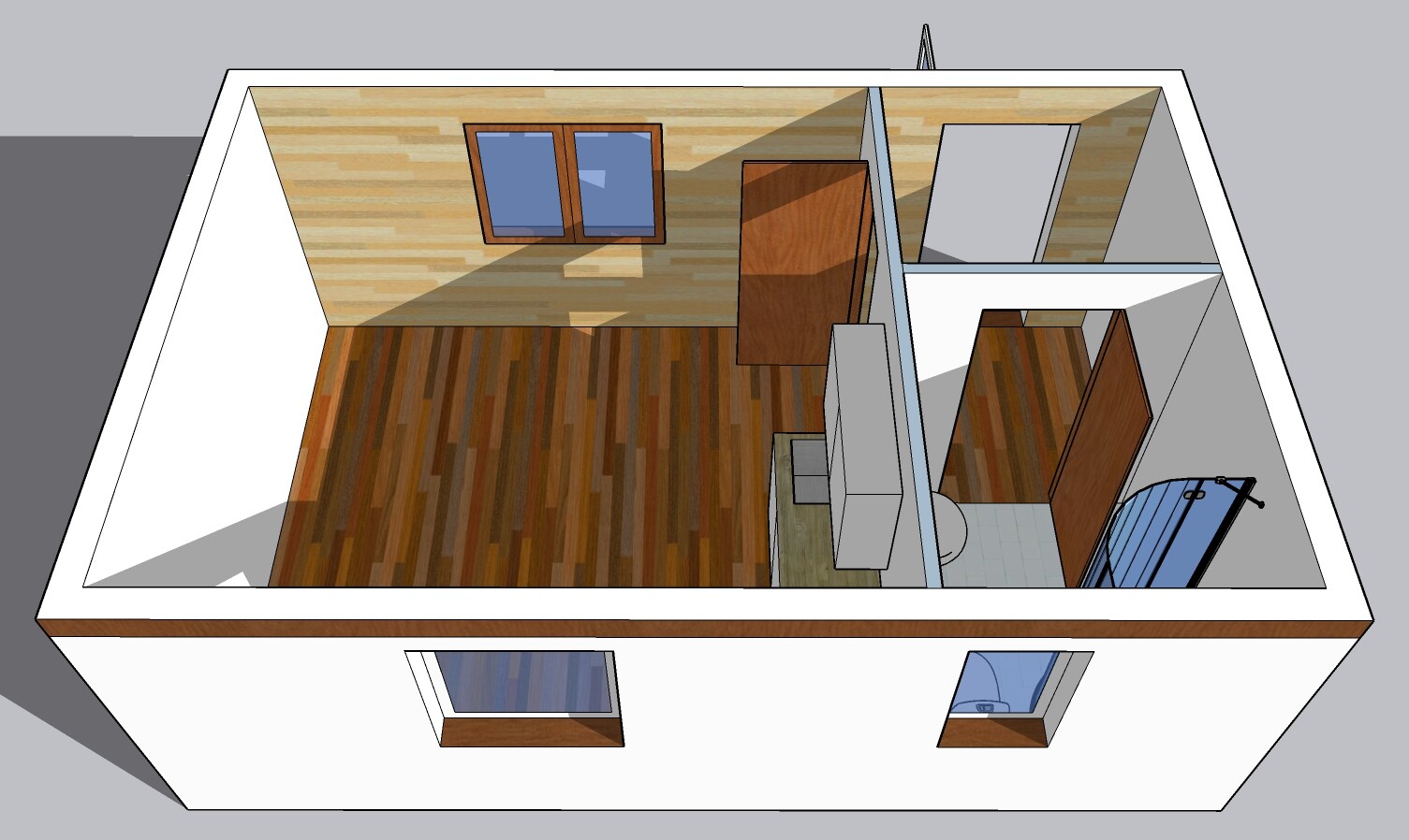 | Layout: | obývací pokoj s kuchyňským koutem, koupelna, WC |