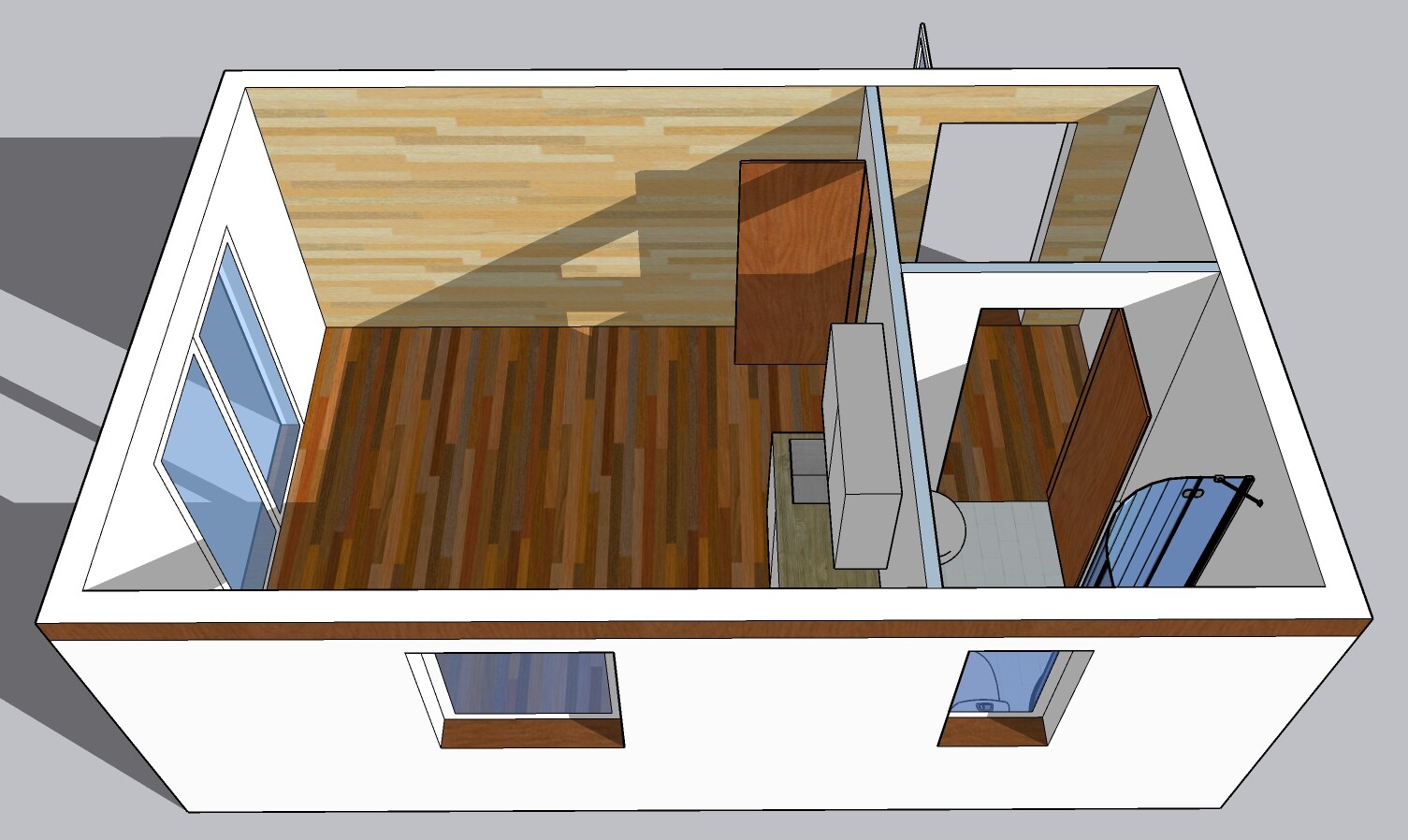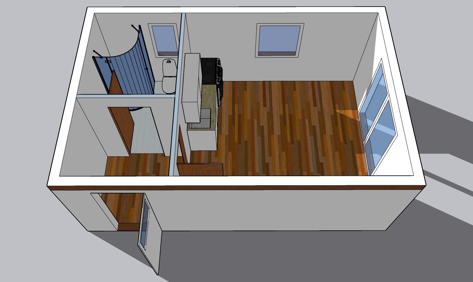 | Layout: | obývací pokoj s kuchyňským koutem, koupelna, WC |