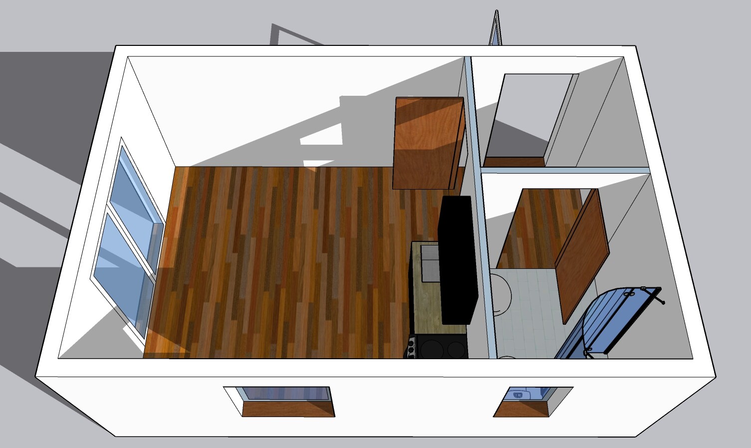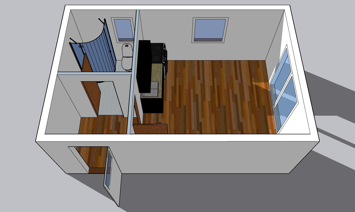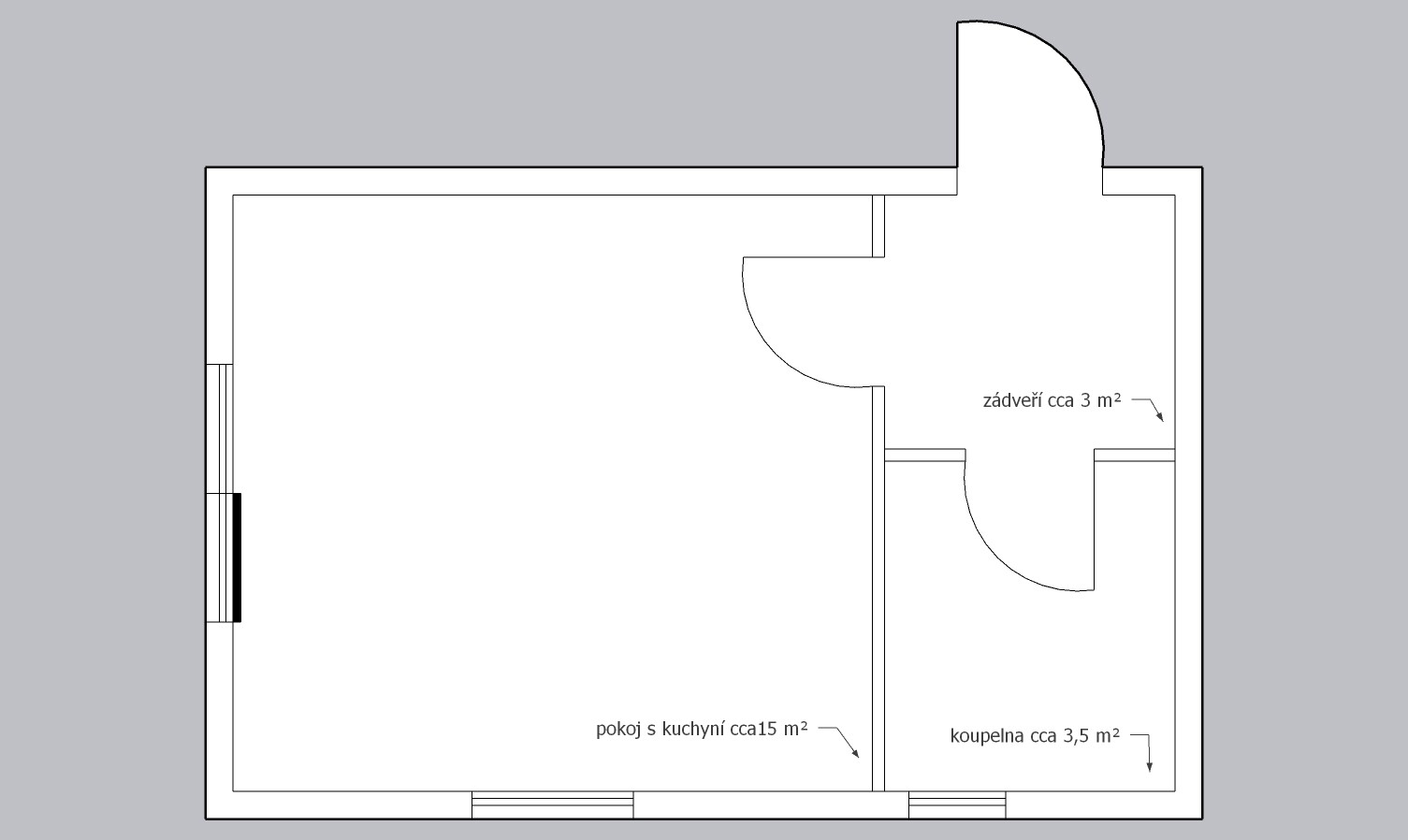 | Layout: | obývací pokoj s kuchyňským koutem, koupelna, WC |