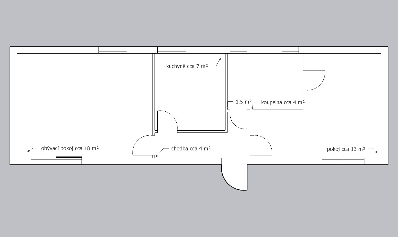| Layout: | 1 ložnice, obývací pokoj, kuchyně, koupelna, 2WC |