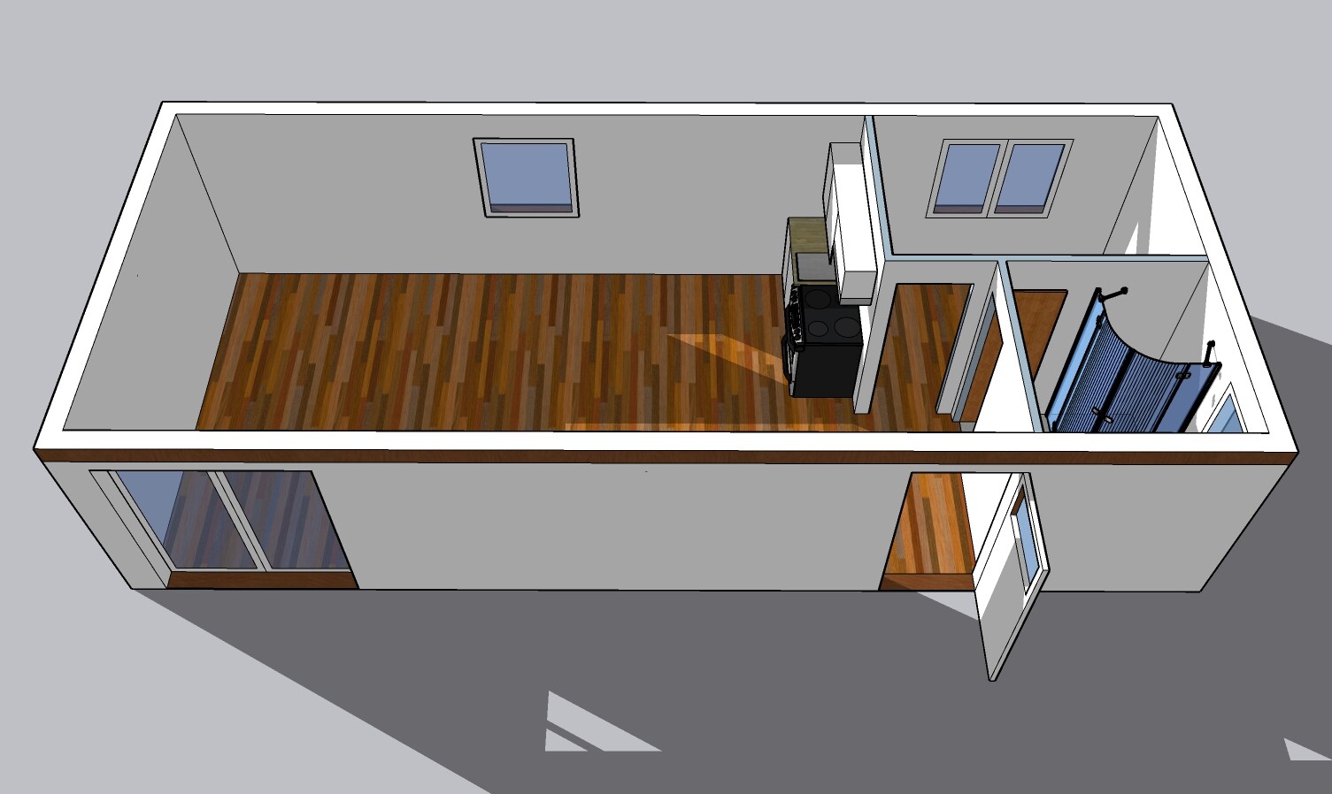 | Výbava: | Nový mobilheim, fasádní lepidlo s dřevěným obkladem, vnitřní stěny sádrokarton, strop dřevěný obklad, kuchyně, (dřez, digestoř, varná deska s troubou), koupelna (WC, umyvadlo, sprchový box, bojler 80l) |