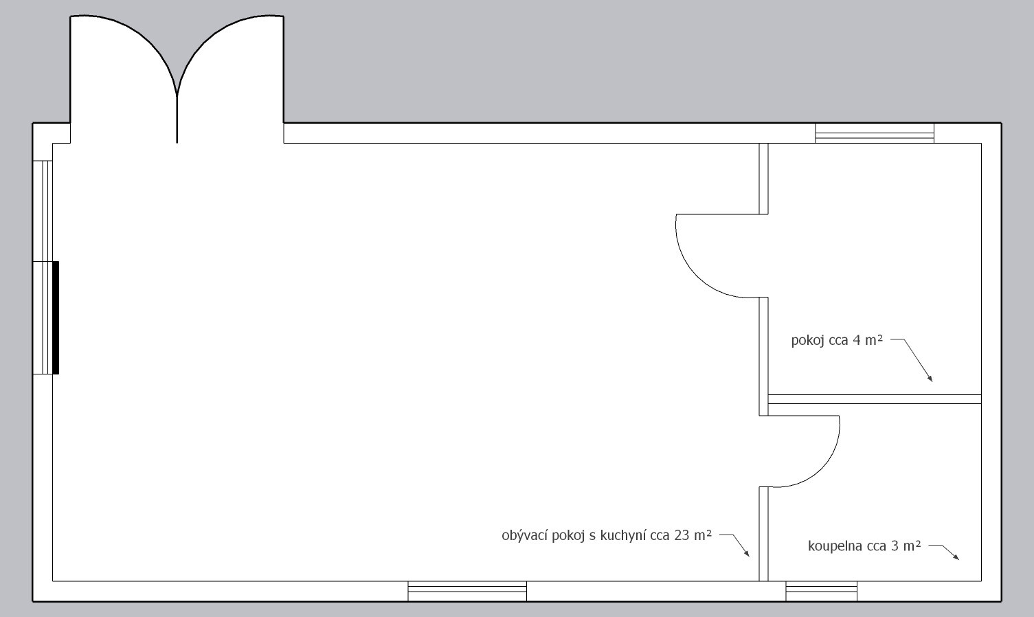 | Layout: | 1 ložnice, obývací pokoj s kuchyňským koutem, podkroví, koupelna, WC |