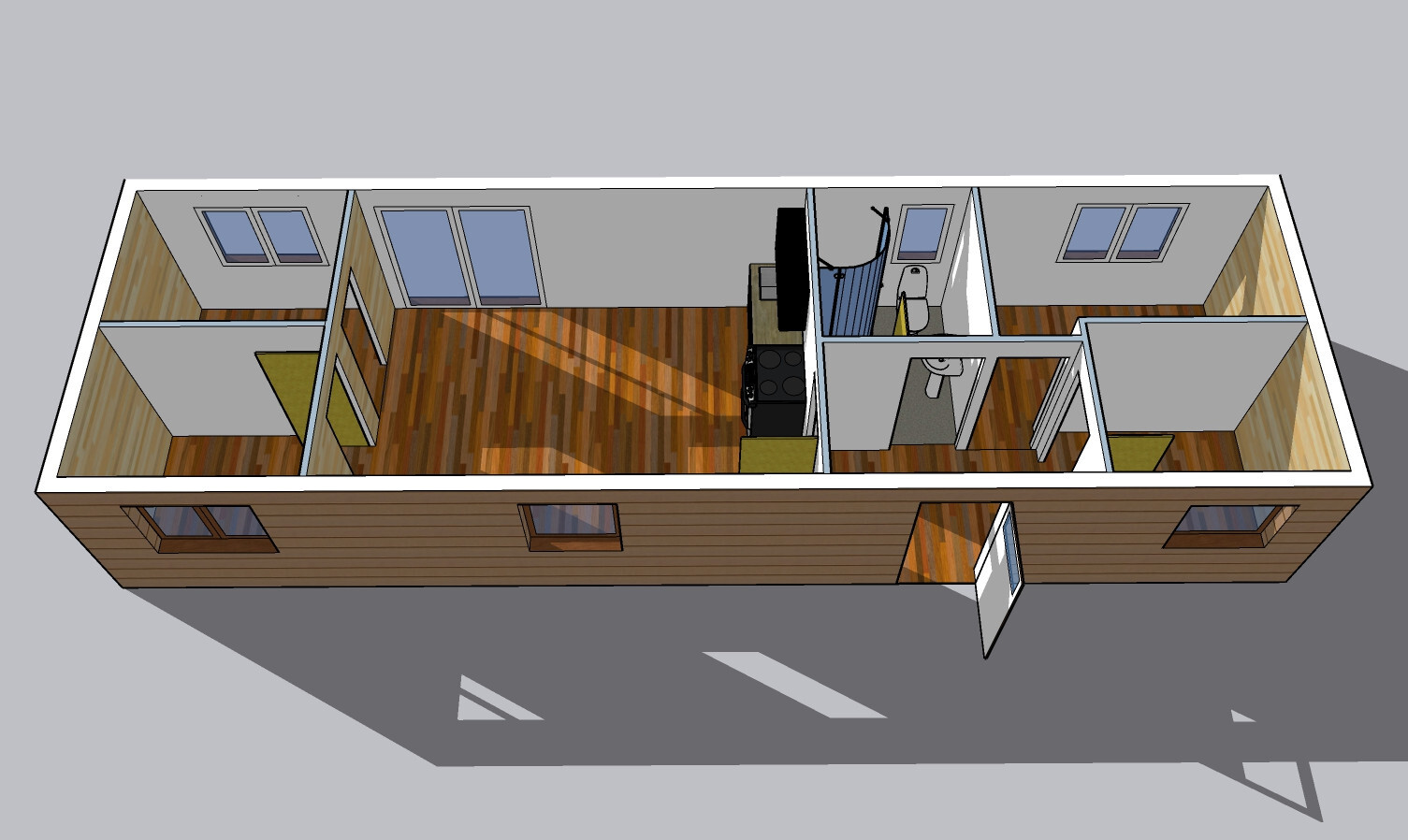 | Layout: | 4 ložnice, obývací pokoj s kuchyňským koutem, koupelna, WC |