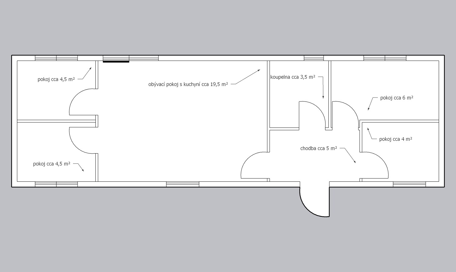 | Layout: | 4 ložnice, obývací pokoj s kuchyňským koutem, koupelna, WC |