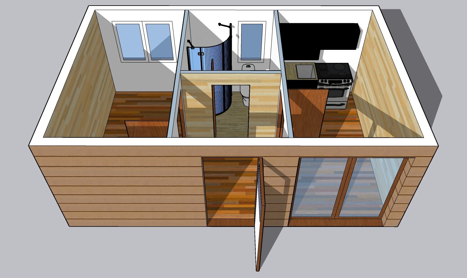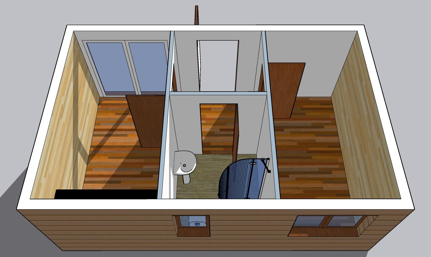 | Výbava: | Nový mobilheim, dřevěný obklad, sedlová střecha, vnitřní stěny sádrokarton a dřevěný obklad, strop dřevěný obklad, podlaha zátěžové lino, kuchyně, (dřez, digestoř, varná deska s troubou), koupelna (WC, umyvadlo, sprchový box, bojler 20l) |