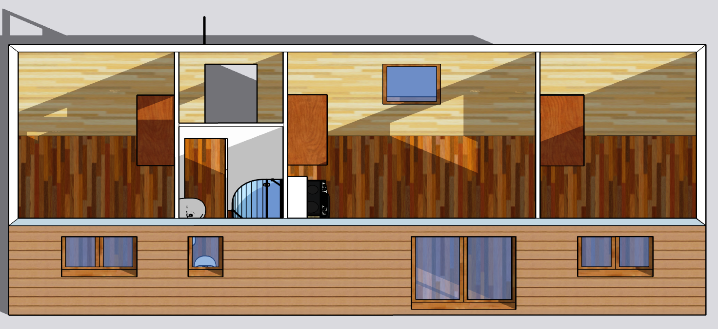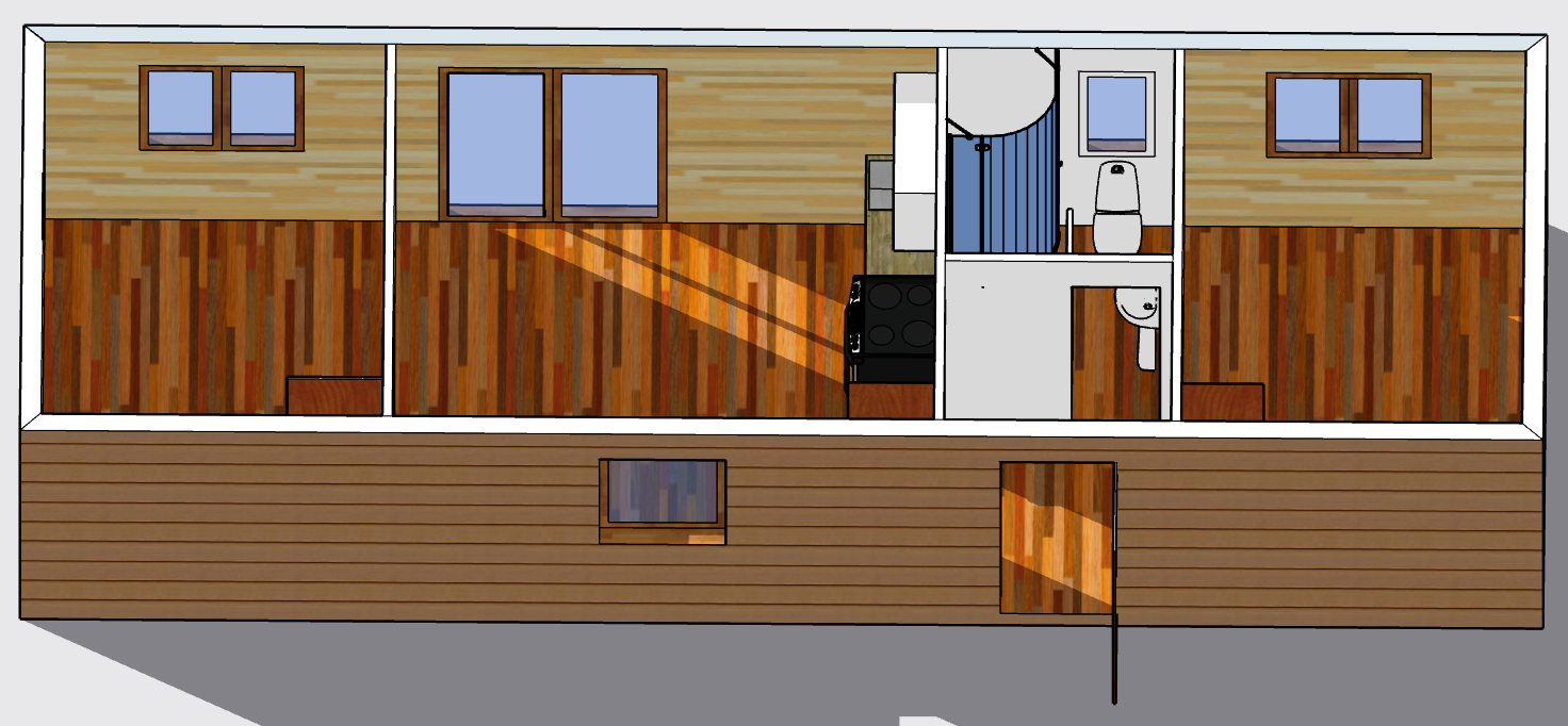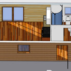 | Výbava: | Nový, plochá střecha, 2,5m světlá výška stropu v celém mobilheimu, dřevěný obklad, vnitřní stěny sádrokarton v kombinaci s dřevěným obkladem, strop dřevěný obklad, podlaha zátěžové lino, kuchyně, (dřez, digestoř, varná deska s troubou), koupelna (WC, umyvadlo, sprchový box, bojler 80l) |
