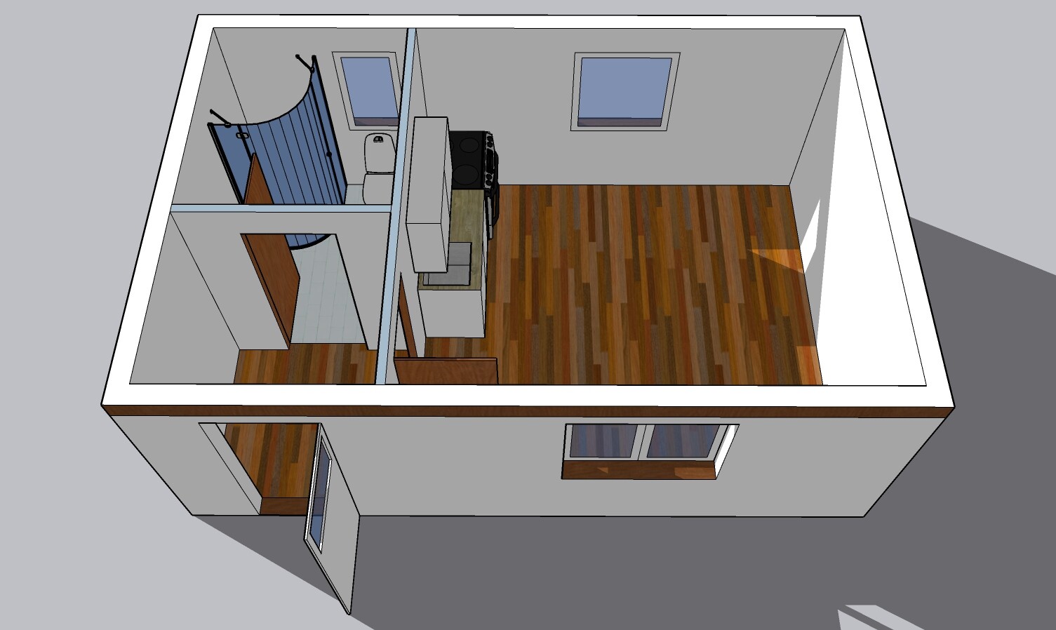 | Layout: | obývací pokoj s kuchyňským koutem, koupelna, WC |