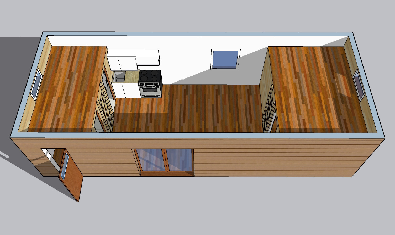 | Layout: | 1 ložnice, obývací pokoj s kuchyňským koutem, koupelna, WC, 2 podkroví |