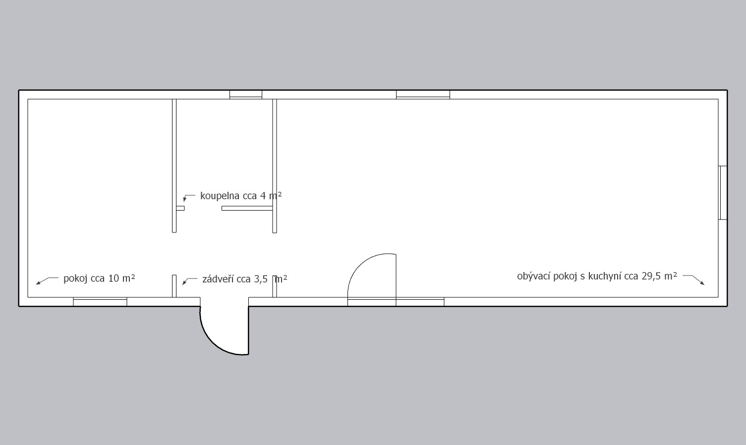| Layout: | Ložnice, obývací pokoj s kuchyňským koutem, koupelna, WC |