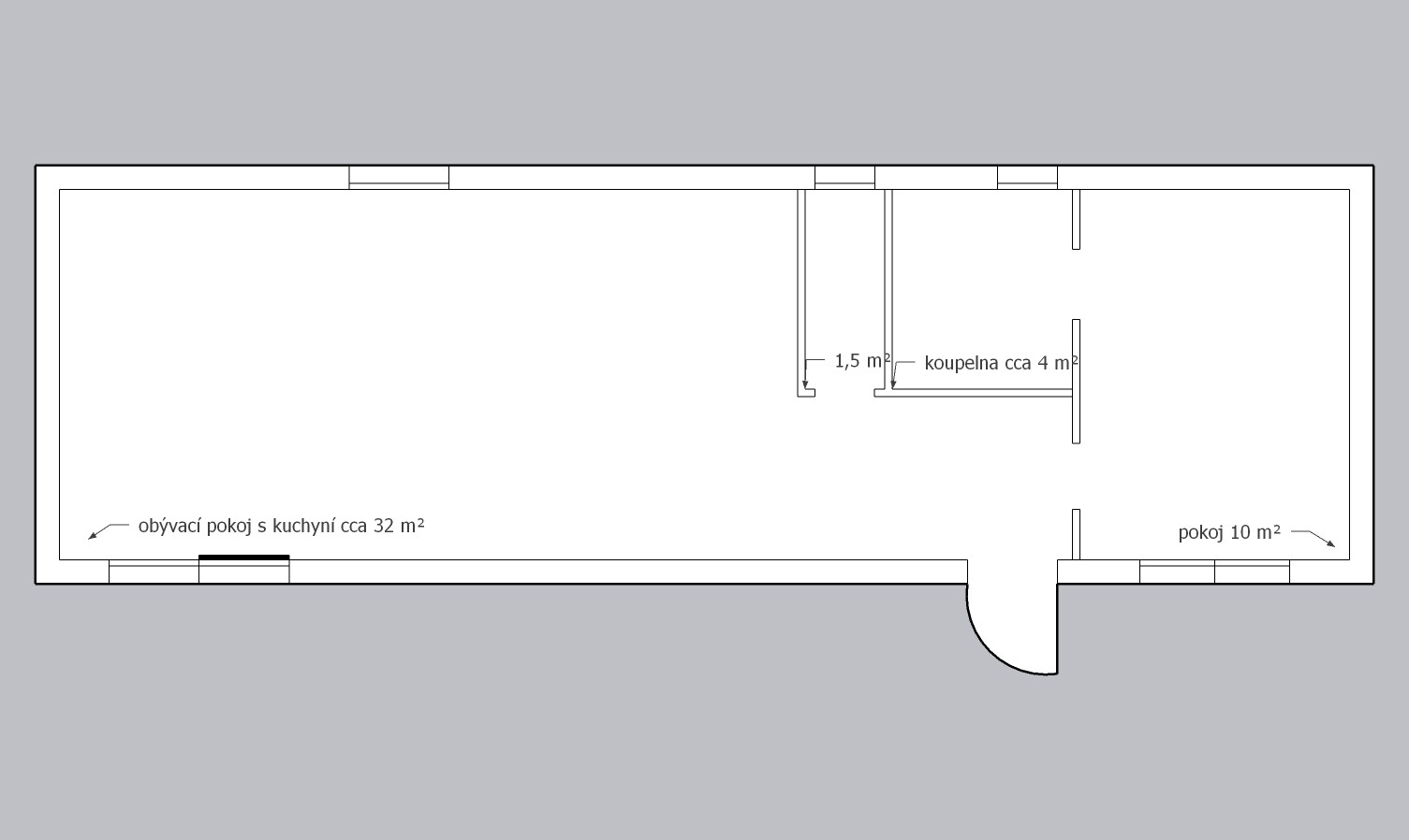 | Layout: | 1 ložnice, obývací pokoj s kuchyňským koutem, koupelna, 2 WC |
